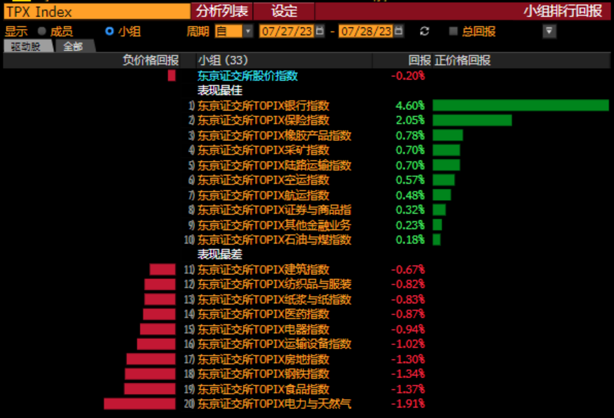 图表14:2023年7月日本央行调整当天的日本股市各行业的表现排名