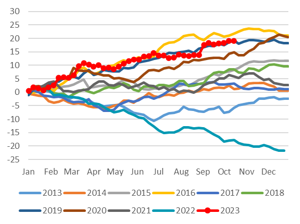 图表10:年初以来日本对外国中长期债券净投资累计额 (万亿日元)