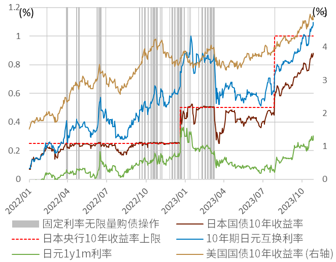 日本央行目前面对较大的利率上行压力,在10月期间日本央行曾多次导入各类操作(临时购债操作、共同担保操作等)来遏制日债利率的快速上行,相关操作起到了一定“减速”或“平滑”的作用,但是仍然无法阻挡日债利率上行的趋势,截至2023年10月27日,日债10年利率为0.88%、日元10年互换利率为1.095%、相较此前都发生了明显的利率上行(图表9)。目前日本央行所设10年利率的硬性上限为1.0%,当日债10年利率触及该水平时日本央行需实施“固定利率无限量购债操作”去无限量地买入日本国债,而该操作的副作用在于扭曲日债收益率曲线的形状并恶化债券市场的市场功能。