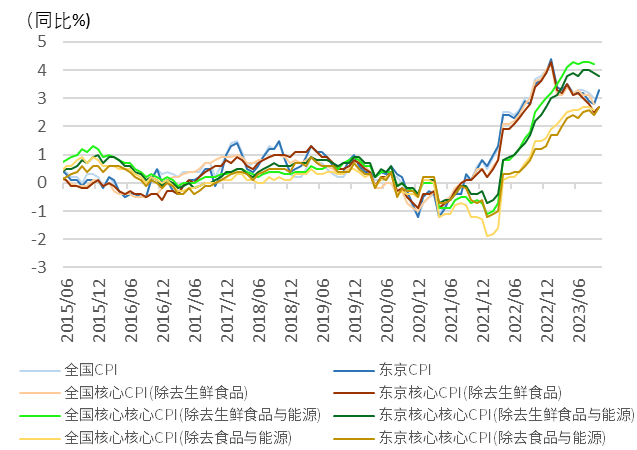 图表7:日本全国与东京的各类通胀指数的走势