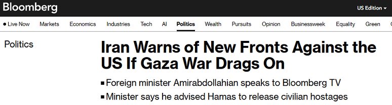 阿卜杜拉希扬拒绝详细说明伊朗可能面临的后果,且否认伊朗下令叙利亚和伊拉克的组织近期攻击美军中东驻地。阿卜杜拉希扬并表示,自哈马斯武装分子在对以色列的袭击中杀死了大约1400人、以色列军队以惩罚性空袭作为回应以来,是华盛顿——而不是德黑兰——在煽动暴力。