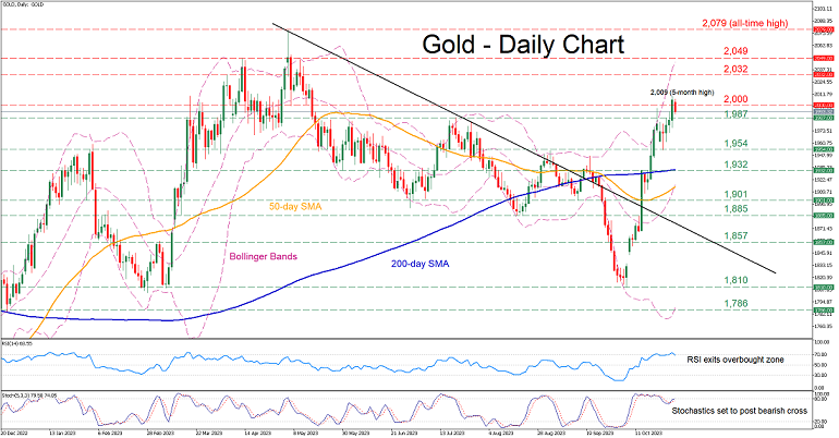 XM.com写道,自10月10日以来,金价一直处于急剧上升趋势,收复200日简单移动均线(SMA)和2000美元/盎司心理关口等关键技术区域,随后触及五个月新高2009美元/盎司。然而,黄金经历了一次小幅回调,可能是由于达到超买的条件。