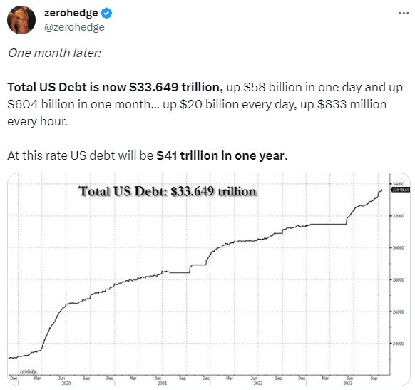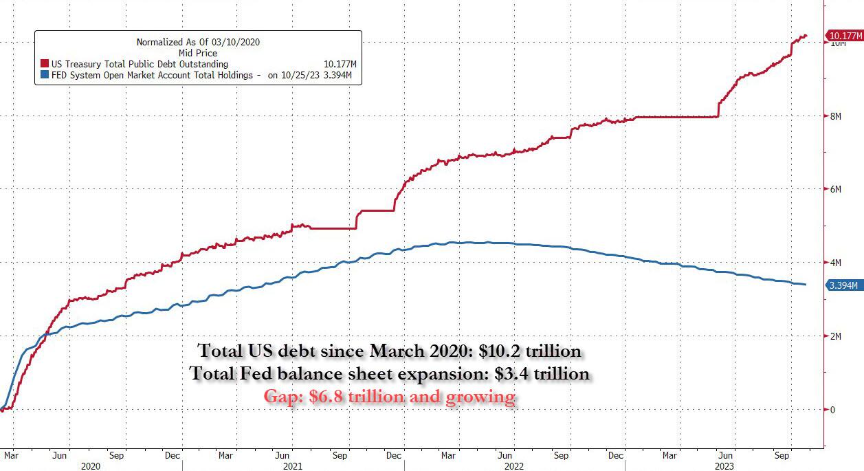 换句话说,在第三季借入1万亿美元之后,美国准备在2023年第四季和2024年第一季再借入1.5万亿美元,总计2.5万亿美元,而这仅适用于该历年的9个月。这意味着在整整12个月的时间里,美国市场债务需求将约为3万亿美元,不包括不可流通的借款,这个数字也越来越惊人。