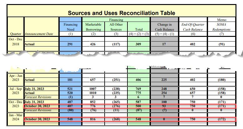 报告内容提到,假设12月底现金余额为7500亿美元,财政部预计在2023年10-12月这一季借入7760亿美元的私人持有净可流通债务。借款预估比2023年7月宣布的低760亿美元,这主要是由于收入增加的预测在一定程度上被支出增加所抵消。