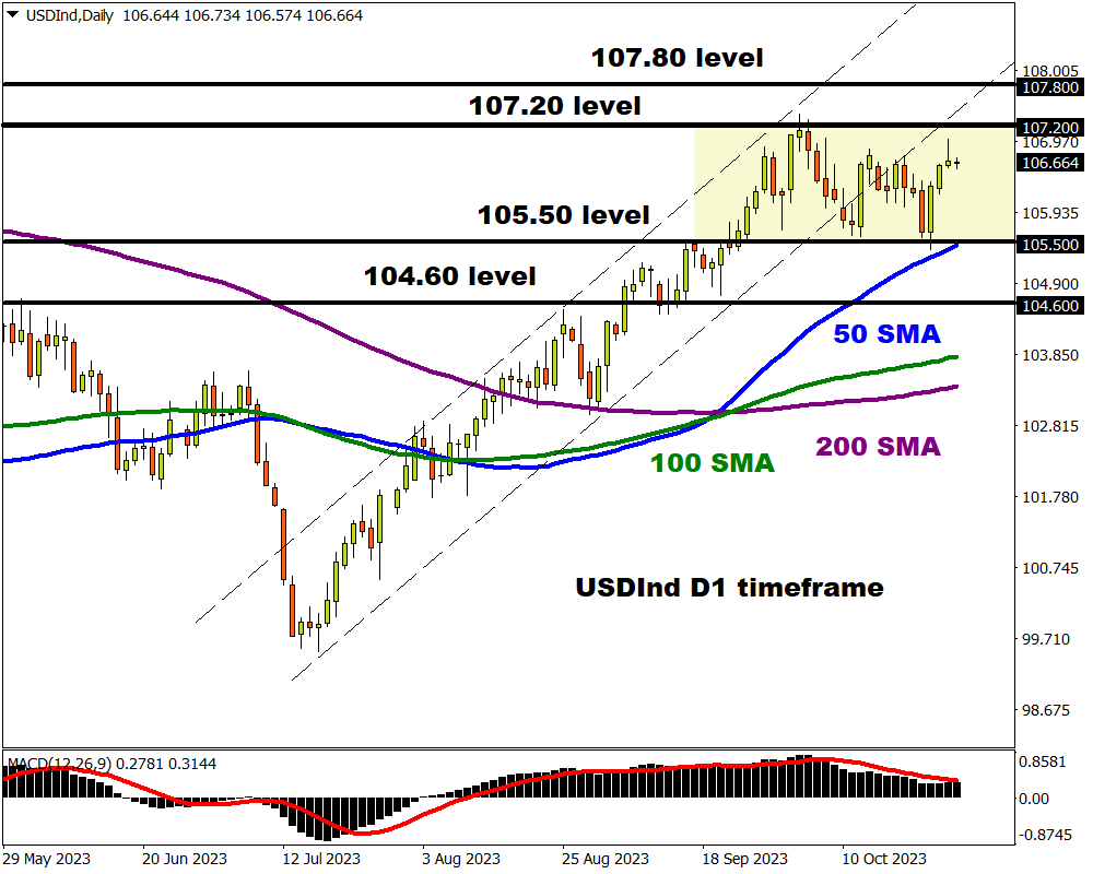 如果突破且日收盘价高于107.20,可能会将价格推至2022年11月以来的最高水平107.80。如果美元工业指数回落至105.50支撑位以下,则可能打开通往104.60的大门。