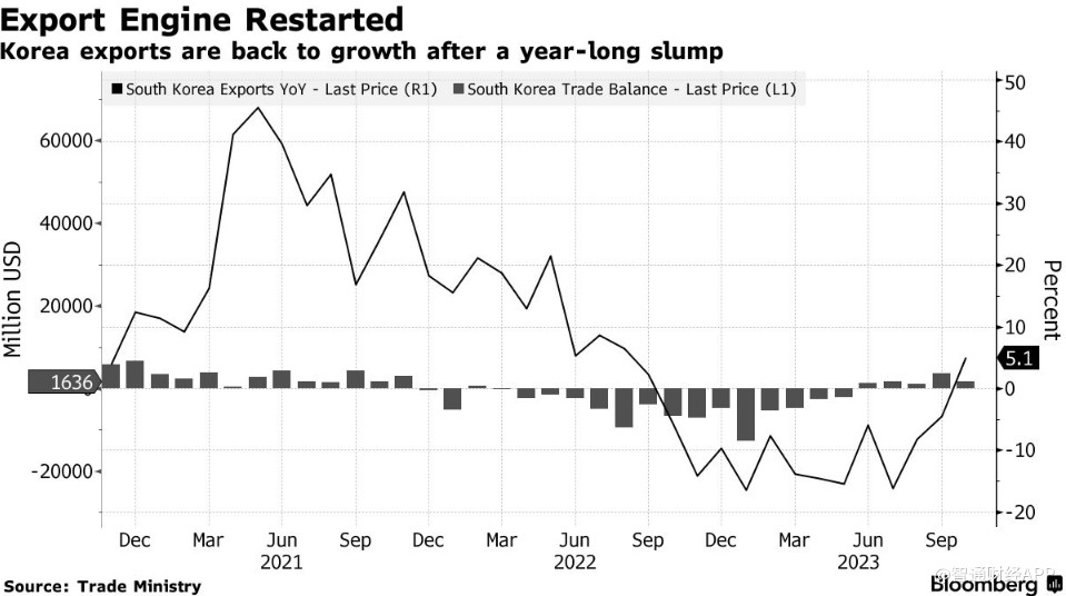 被市场视为全球经济“金丝雀”的韩国出口自去年年底以来首次增长,这是该国经济增长前景的一个积极信号,也表明全球需求正在显示出弹性。韩国关税厅周三公布的数据显示,韩国10月份出口同比增长5.1%,为13个月来首次反弹。排除工作日差异,日均发货量也增长了7.6%。进口下降9.7%,贸易顺差达16亿美元。