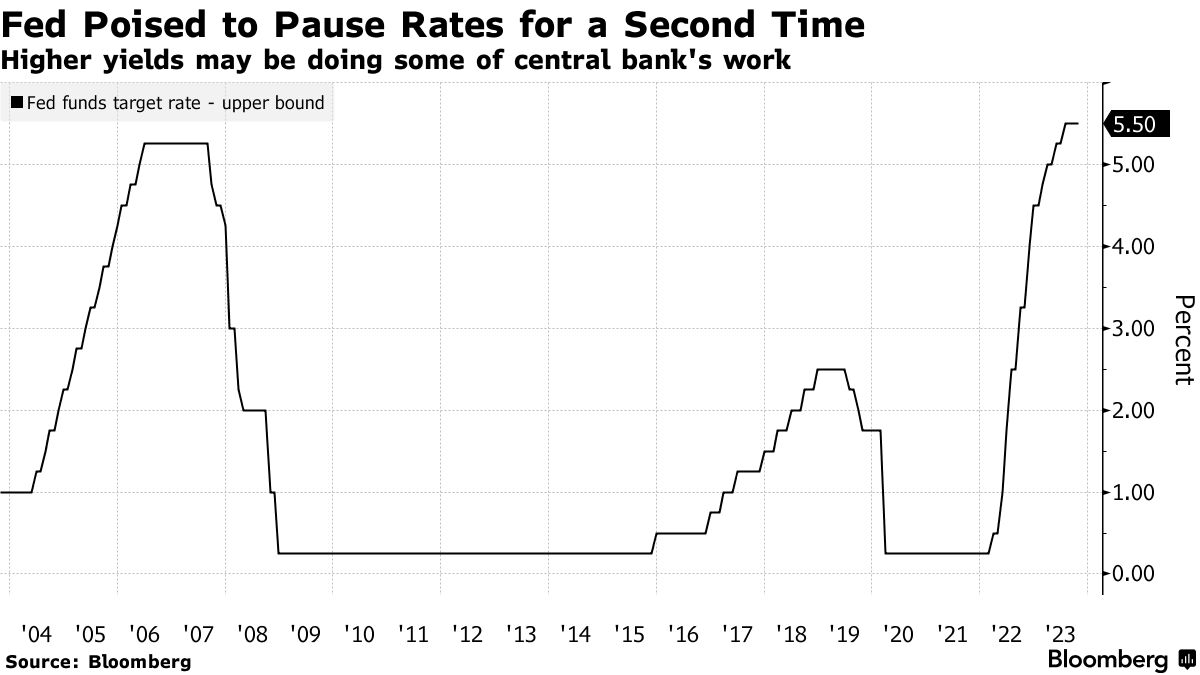 美联储主席鲍威尔说过,在加息行动接近尾声时,美联储官员更愿意先等待,以便评估过去加息对经济的影响。由于通胀率仍远高于委员会2%的目标,经济增长率也接近两年来的高点,决策者希望保留再次加息的选择。这一点预计不会有异议。