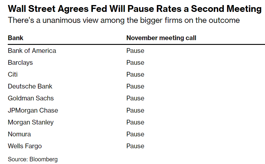 彭博经济学家Anna Wong、Stuart Paul、Eliza Winger和Estelle Ou表示,美联储将在10月31日至11月1日的FOMC会议上维持利率稳定,这是连续第二次暂停加息。不过,我们预计政策声明和鲍威尔的言论将为进一步加息敞开大门。延长暂停是否会变成加息周期的明确结束,将取决于未来几个月的劳动力和通胀数据。