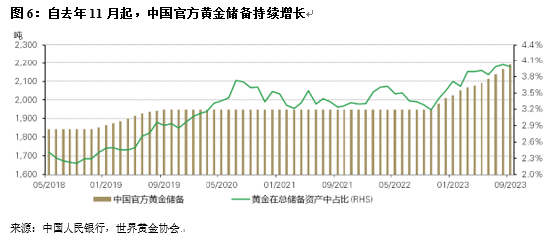 截至三季度末,中国官方黄金储备已达2,192吨,三季度累计增储78吨。以美元计,黄金在中国外汇储备中的占比为4%,持平历史高点。2023年年初至今,中国官方黄金储备的增长从未间断,前九个月已累计增储181吨。