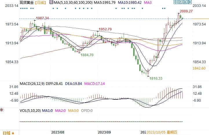 汇通财经APP讯——周一(10月30日),经过连续三个交易日的上冲之后,现货黄金周一出现高位获利回吐下跌0.57%至1994.95美元/盎司,但仍离2000美元关口不远。这当中,主要也是本周将迎来美联储的议息会议,使交投情绪略保持谨慎所致。