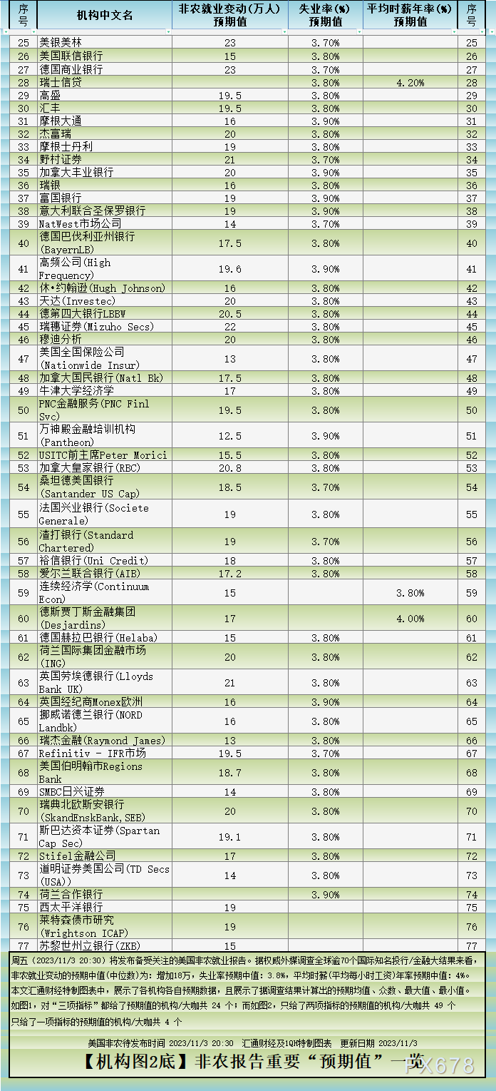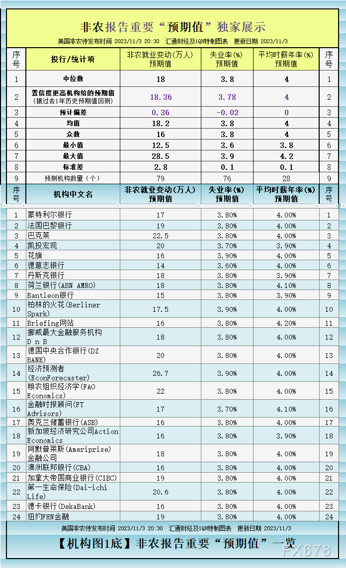 汇通财经APP讯——周五(2023/11/3 20:30)将发布备受关注的美国非农就业报告。据权威外媒调查全球逾70个国际知名投行/金融大结果来看,非农就业变动的预期中值(中位数)为:增加18万,失业率预期中值:3.8%,平均时薪(平均每小时工资)年率预期中值:4%。本文汇通财经特制图表中,展示了各机构各自预期数据,且展示了据调查结果计算出的预期均值、众数、最大值、最小值。如图1,对“三项指标”都给了预期值的机构/大咖共 24 个;而如图2,只给了两项指标的预期值的机构/大咖共 49 个只给了一项指标的预期值的机构/大咖共 4 个。