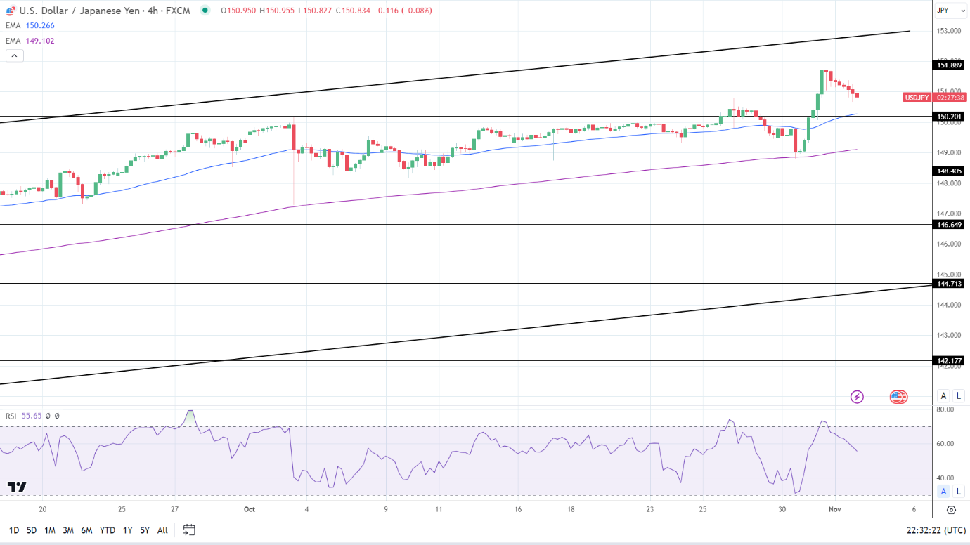 14周期4小时RSI为55.65,表明美元/日元在进入超买区域之前将升至151.889阻力位。
