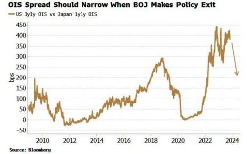 下图显示了美国与日本 1y1y OIS 之间的差异。随着日本退出负利率政策,市场应该对日本央行的政策利率进行更高的定价,特别是在通胀仍然高企的情况下,而在美国,市场将越来越多地期待降息,从而导致利差收窄。(如果人们相信日元将继续上涨,则无需进行货币对冲。)