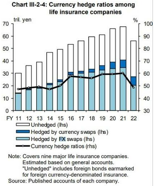 上个月日本央行金融体系报告(FSR)的下图显示,2022年,寿险公司的货币对冲比率大幅下降,寿险公司是外国资产最大的对冲买家之一,也是其他对冲投资者的代表。我们没有2023年的数据,但鉴于日元持续走软,整体投资者的货币对冲比率可能会更低。