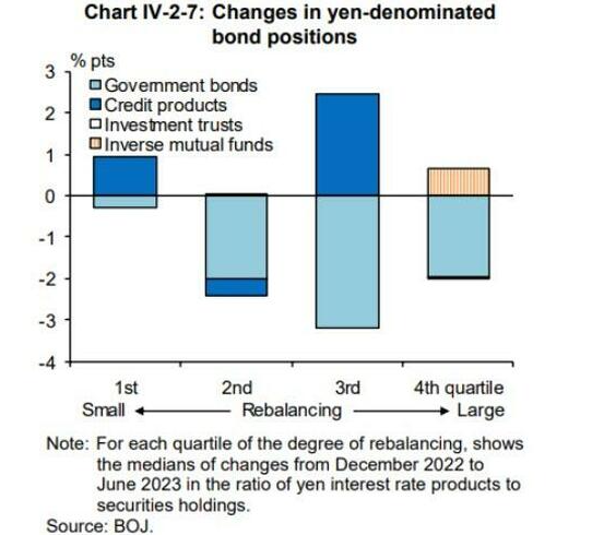 收益率曲线控制政策的放弃也将导致日本债券收益率上升。10 年期利率上限已迅速升至接近1%的收益率,目前被视为日本央行的“参考点”。FSR显示,养老金公司和银行减少了日元计价债券的持有量,使其减持(下图中的浅蓝色条显示日本银行持有的国内政府债券的变化)。