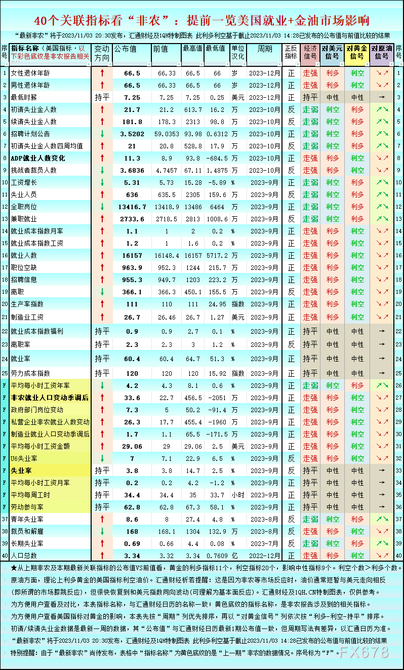上图显示,从上期非农及本期最新关联指标的公布值VS前值看,黄金的利多指标11个,利空指标20个,影响中性指标9个。利空个数>利多个数。原油方面,理论上利多黄金的美国指标利空油价。汇通财经析若提醒:这是因为非农等市场反应时,油价通常短暂与美元走向相反(即所谓的市场膝跳反应),但很快恢复到和美元指数同向波动(可理解为基本面反应)。“最新非农”将于2023/11/03 20:30发布,汇通财经及1QH特制图表 此利多利空基于截止2023/11/03 14:28已发布的公布值与前值比较的结果。特别提醒:由于“最新非农”尚待发布,表格中“指标名称”为黄色底纹的是“上一期”非农的数据情况。序号标为“F”。