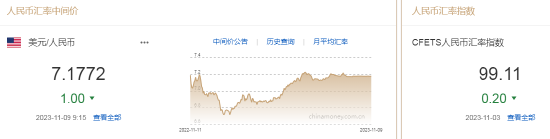 11月9日,人民币中间价报7.1772,上调1点,上一交易日中间价报7.1773。
