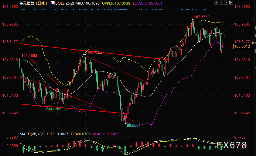 美元指数本周初以来自一个半月低位持续反弹,但昨日冲高回落,关注106-106.11区域压力,其中106.11为日图布林带中轨当前所在。