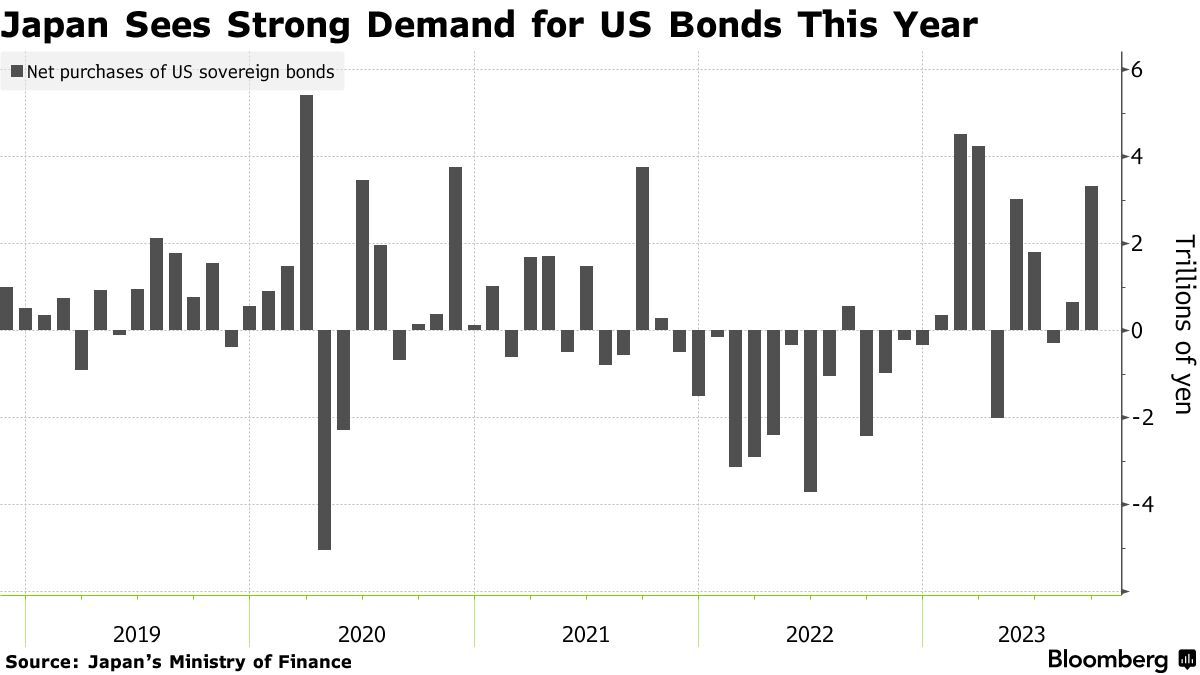 不过,最新数据表明,日本与美国国债之间巨大的收益率差距仍在吸引日本投资者购买美债。除了4月和7月,日本投资者在2023年以来的其他每个月都是美债的净买家。