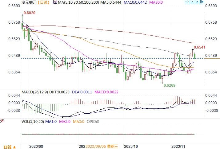 周三(11月15日),澳元/美元经过周二的大幅反弹上升后进入整理状态,收盘持平于周二的收市价(0.6505)。周三当天,澳洲公布第三季薪资价格指数较前季上升1.3%,符合预期;同比上升4%(预期为上升3.9%)。市场对于该数据的反应平平,因为澳洲三季度的这项薪资增长幅度仍远低于许多其他发达国家的水平。为此,市场怀疑仅凭薪资数据能否触发央行进一步收紧政策。目前,市场预期澳洲12月加息的可能性仅7%。期货行情也暗示,澳洲央行本轮加息周期已完成的机率约为50%。因此,对于澳联储还将会进一步升息不可抱有太大的期盼。但在另一方面,中国公布的零售销售和工业生产数据超预期,预示着中国对大宗商品的需求将持续增长,使得澳元或会从中进一步获得支撑。4小时图上,澳元/美元存在着超买整理,若整理后能撑持在0.6440水平之上,后市或仍有望向上攀行。