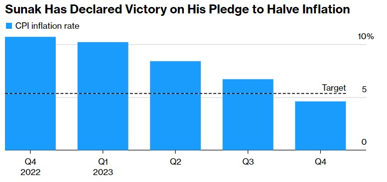 对抗通胀对苏纳克来说也有很大的政治影响,尽管他除了抵制削减所得税和增加公共部门员工工资的呼吁外,几乎没有控制物价的权力。苏纳克设定了一个相对温和的目标——将通货膨胀率从超过10%的峰值降低一半,但就在几个月前,这一目标似乎还不确定。