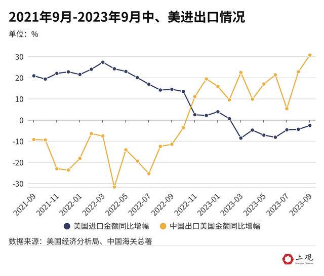 美国进口金额的同比增幅(季调)从去年3月开始下滑,在今年3月进入负增长。截至今年9月,同比增幅已连续7个月为负值。