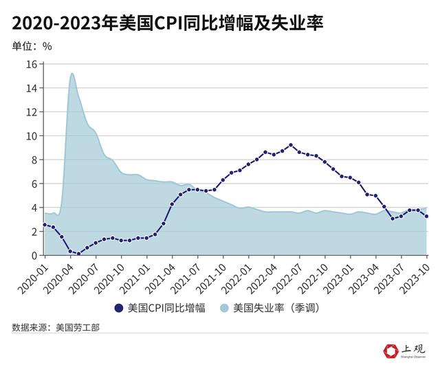 受疫情影响,美国失业率在2020年年初开始上升,4月创下近十年峰值,达到14.7%。