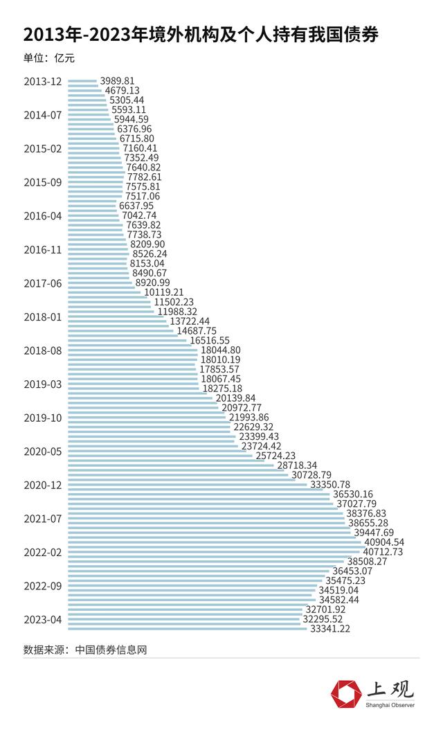 最直接的就是境外机构及个人持有我国债券的规模总量。