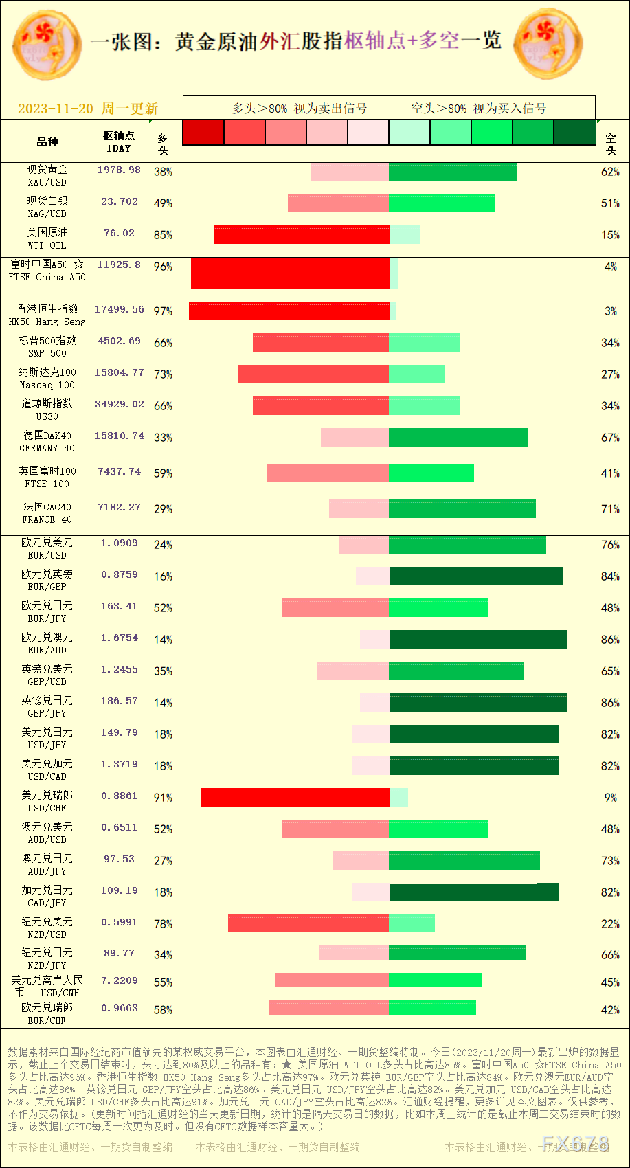 汇通财经APP讯——一张图:黄金原油外汇股指“枢纽点+多空占比”一览。今日(2023/11/20周一)最新出炉的数据显示,截止上个交易日结束时,头寸达到80%及以上的品种有:★ 美国原油 WTI OIL多头占比高达85%。富时中国A50 ☆FTSE China A50多头占比高达96%。香港恒生指数 HK50 Hang Seng多头占比高达97%。欧元兑英镑 EUR/GBP空头占比高达84%。欧元兑澳元EUR/AUD空头占比高达86%。英镑兑日元 GBP/JPY空头占比高达86%。美元兑日元 USD/JPY空头占比高达82%。美元兑加元 USD/CAD空头占比高达82%。美元兑瑞郎 USD/CHF多头占比高达91%。加元兑日元 CAD/JPY空头占比高达82%。汇通财经提醒,更多详见本文图表。仅供参考,不作为交易依据。