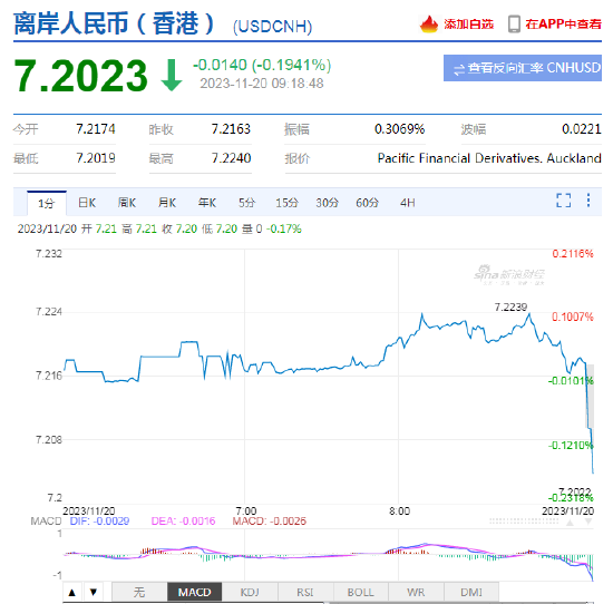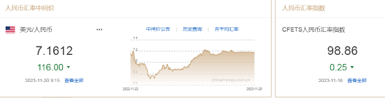 11月20日,人民币中间价报7.1612,上调116点,升值至2023年8月11日以来最高,升幅创2023年9月12日以来最大。上一交易日中间价报7.1728。离岸人民币升值逼近7.20。