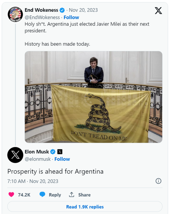 不可否认的是,在许多人眼中,米莱或许是阿根廷的救世主,选举结果出炉后,马斯克评价称“阿根廷的繁荣即将到来”。