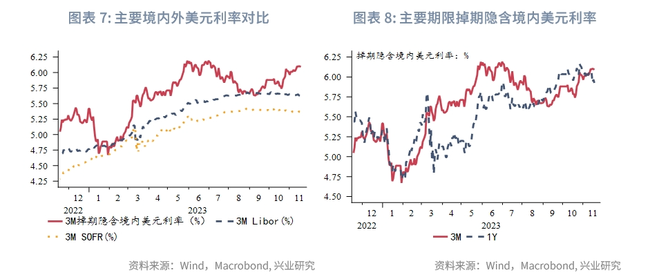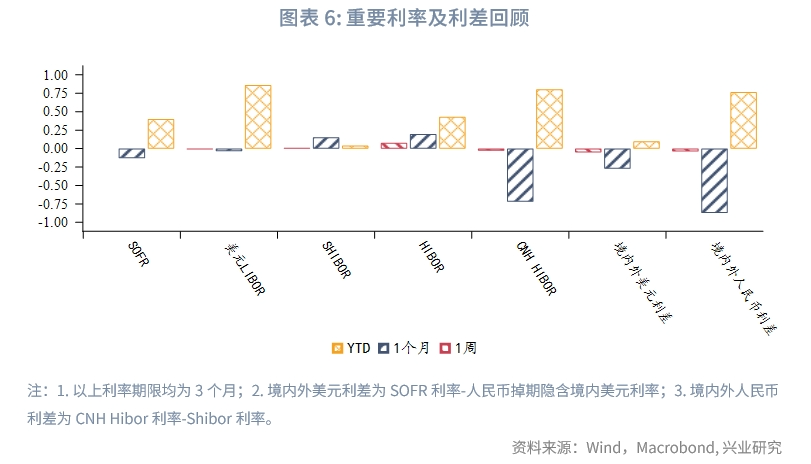 美元流动性方面,境内掉期隐含美元利率曲线倒挂加深,3M小幅上行,1Y回落。SOFR、美元Libor利率趋平,短期限境内外美元利差(境外-境内)收敛。