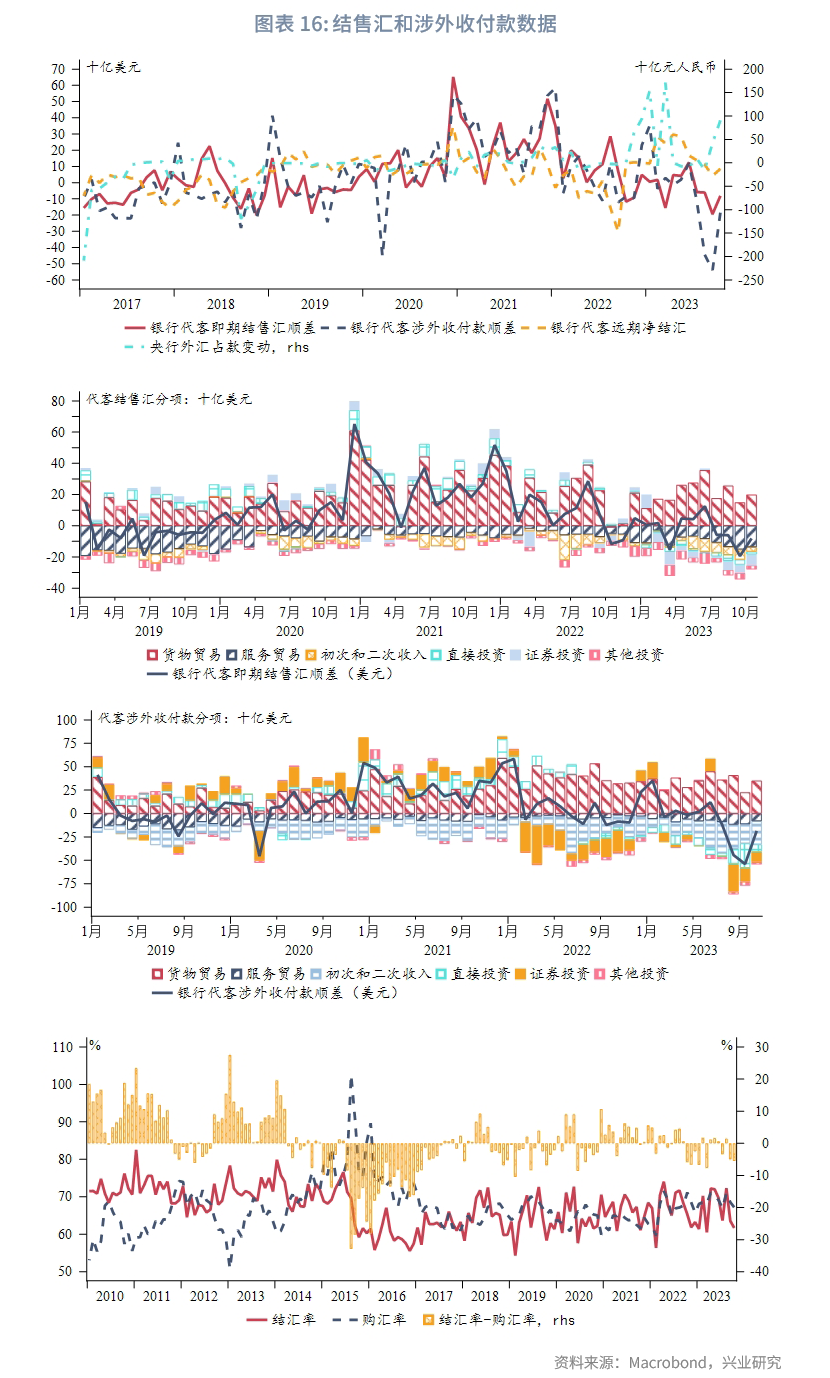 从分项来看,10月银行代客结售汇环比逆差缩窄的主要原因是货物贸易顺差扩大,且初次和二次收入逆差回落。10月银行代客涉外收付款逆差缩窄主要原因是货物贸易净流入扩大,且直接投资和证券投资逆差双双收窄。