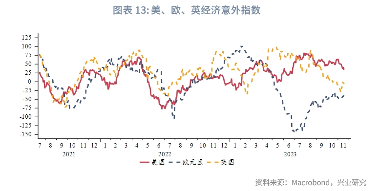 本周公布的部分美国关键经济数据表现疲软,市场在笃定联储已暂停加息的基础上加码了降息预期的押注。美国11月11日当周首次申领失业金人数升至23.1万人,创下3个月新高,预期值22万人;续请失业金人数186.5万人,创下近2年来新高,预期值184.6万人。受汽车业罢工活动影响,美国10月工业产出环比下降0.6%,制造业产出环比下降0.7%,均大幅弱于预期。