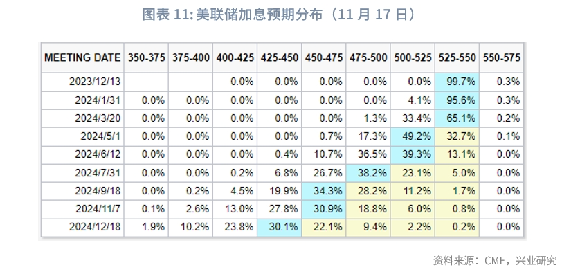 美国 10 月 CPI 同比增长3.2%,低于预期的 3.3%,低于前值 3.7%;核心 CPI同比增长 4%,低于预期值和前值 4.1%。CPI 数据公布后美债收益率、美元指数短线跳水,美元兑人民币快速下破。市场对12 月、1月的加息预期几乎归零,预期的最早降息时点由明年 6 月提前至 5 月,预期的降息幅度由 75bp 扩大至 100bp。