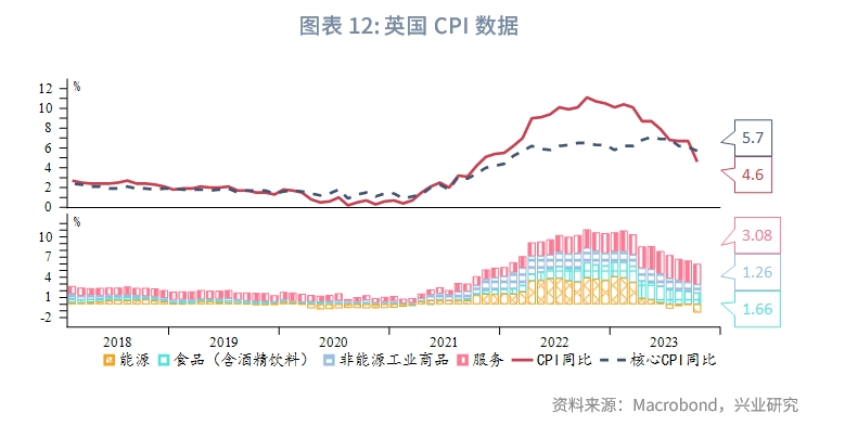 英国10月CPI同比从上月的6.7%大幅下降至4.6%,低于市场预期的4.8%,为2021年11月以来新低,环比涨幅持平,而市场预期为环比上涨0.1%;核心CPI同比从上月的6.1%降至10月的5.7%,预期为5.8%。和英国央行11月议息会议的预测相比,核心商品、服务降幅更大,但能源、食品更具粘性。