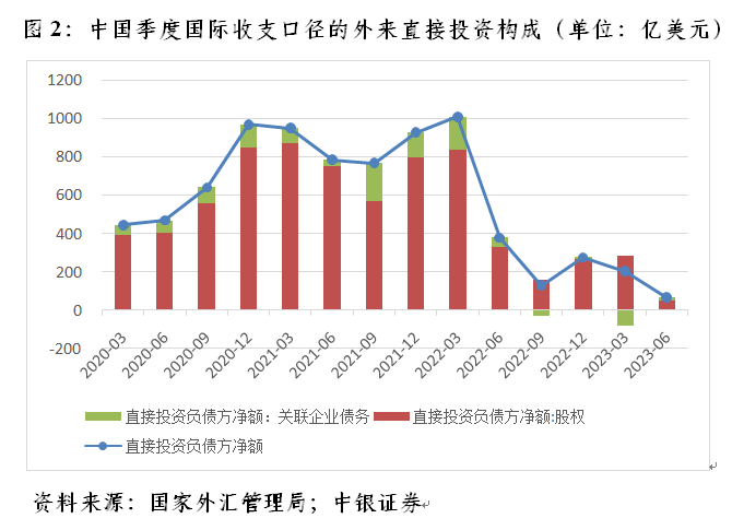 鉴于2023年三季度季均2年期和10年期美债收益率分别环比上升16和78个基点,预计当季关联企业债务将偏向净流出,上季为净流入16亿美元。2023年二季度外来直接投资的股权投资净流入仅为51亿美元,若当期撤资规模稍大一点的话,不排除该项目有可能转为负值(见图2)。