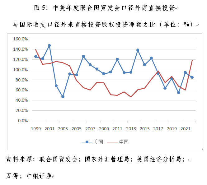 如1999~2022年间,美国联合国贸发会口径的外商直接投资金额与国际收支口径外来直接投资股权投资净额之比平均为98.7%,其中有10个年份该比例超过了100%,占到总年份的43.5%。同期,中国两个口径的平均占比为81.9%,其中有7个年份该比例超过了100%,占到总年份的30.4%(见图5)。