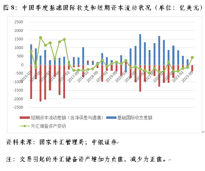 也就是说,2023年三季度,中国外汇储备余额下降779亿美元,交易引起的外汇储备资产减少贡献了55.5%,全球股债汇“三杀”引起的负估值效应337亿美元,仅贡献了45.5%。上次基础国际收支逆差的2020年一季度,短期资本净流入174亿美元,储备资产减少253亿美元,其中外汇储备资产减少248亿美元,贡献了同期外汇储备余额总降幅的52.4%(见图8)。