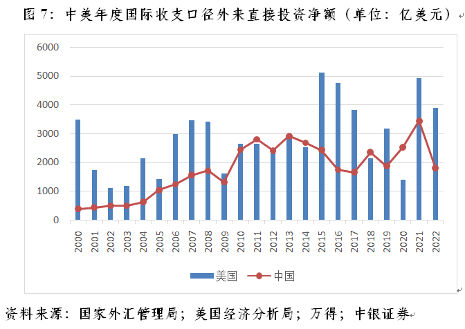 实际上,国际收支口径的外来直接投资净额波动较大也并非中国的专利。从年度数据看,2000~2022年间,美国外来直接投资净流入有13个年份环比负增长,占到总年份的56.5%,环比降幅最大的为2020年(56.2%),且2001~2002年和2016~2018年间出现了连年环比下降;中国有9个年份环比负增长,占到总年份的39.1%,降幅最大的为2022年(47.6%),且2014~2017年间出现了连年环比下降(见图7)。
