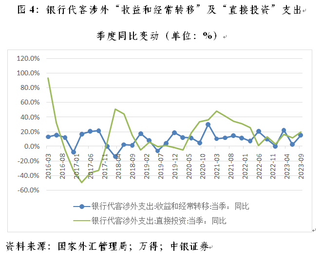 实际上,虽然三季度国际收支正式数据尚未公布,但当季银行代客涉外收付数据却是按月发布。如果外商大规模撤资和利润汇出,应当按照现金收付制反映在银行代客涉外收付的相关统计科目中,而相关统计并不支持前述观点。2023年三季度,银行代客涉外收付的收益和经常转移项下累计支出982亿美元,同比增长15.0%,较2018~2022年季均增速高出6.3个百分点,但也仅排在2020年一季度以来同比增速的第四位,并低于2023年一季度同比22.0%的增速;直接投资项下累计支出2147亿美元,增长19.3%,较2018~2022年季均增速还低了0.1个百分点,并且直接投资项下的涉外支出还包含了对外直接投资的股权投资,而不仅是外来直接投资的撤资(见图4)。
