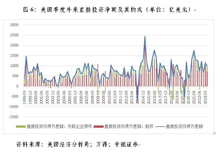1999年一季度至2023年二季度间,美国国际收支口径的外来直接投资出现过三次净流出,分别为2014年一季度713亿美元、2018年二季度67亿美元和2020年一季度542亿美元。其中,第一次为外来直接投资的股权投资净流出797亿美元所致,相当于当季外来直接投资净流出额的1.12倍;后两次为关联企业债务净流出所致(见图6)。由此可见,中国1998年初以来季度外来直接投资首次出现少量净流出并非“惊世骇俗”,因为同经济和金融周期一样,外商直接投资也会有波峰和波谷的周期性变化。