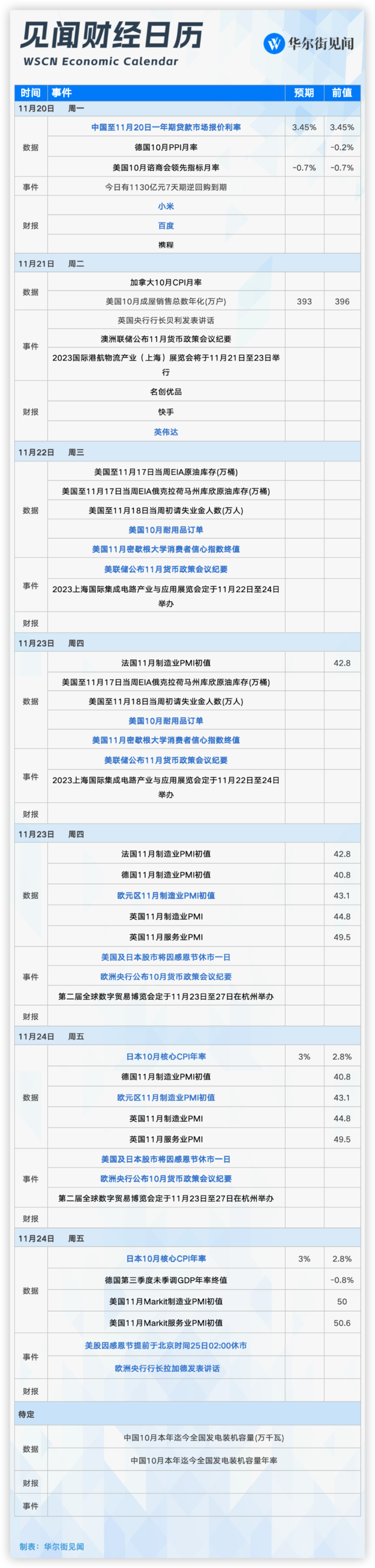 下周英伟达、百度、小米、快手等公司将发布财报。重磅事件方面,美联储将于下周三布11月货币政策会议纪要;OPEC+部长级会议将于下周日(11月26日)举行,会上将讨论稳油价的后续措施。重磅数据方面,中国将公布全社会用电量数据,以及一年期贷款市场报价利率;日本、德国、英国和欧盟将发布11月PMI(初值),德国还将发布第三季度GDP总量,日本将发布10月CPI数据。