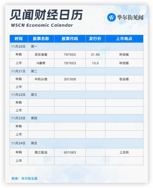 11月20日,N康希上市,21日中机认检开启申购,24日锦江航运开启申购。