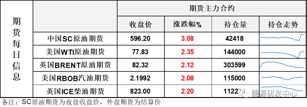 【1】WTI主力原油期货收涨1.79美元,涨幅2.35%,报77.83美元/桶;布伦特主力原油期货收涨1.71美元,涨幅2.12%,报82.32美元/桶;INE原油期货收涨3.08%,报596.2元。