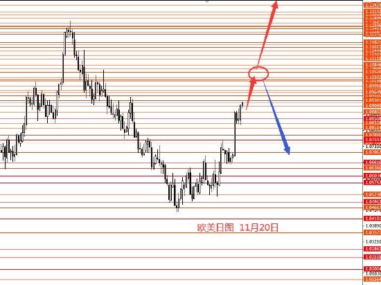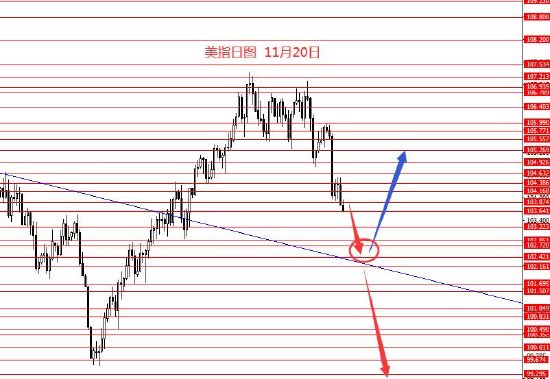 11月20日,美指上周正如预期向下运行,目前下跌趋势明朗,只是现在没有短线合适的理想建仓价,上周一框架思路延用,继续看跌,下方关注102.80区域一线强支撑,到时再看K线表现方式。若能成功跌破102.80-102.20区域一线强支撑,大概率会向下大跌至97.30附近,反向就是得以支撑向上反弹,到时候再看情况吧。