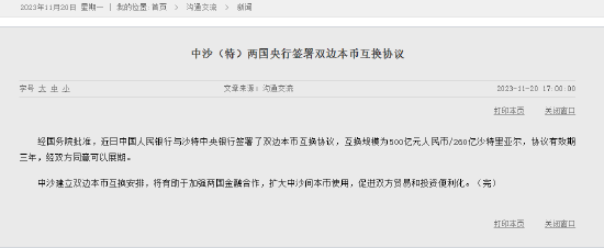 经国务院批准,近日中国人民银行与沙特中央银行签署了双边本币互换协议,互换规模为500亿元人民币/260亿沙特里亚尔,协议有效期三年,经双方同意可以展期。