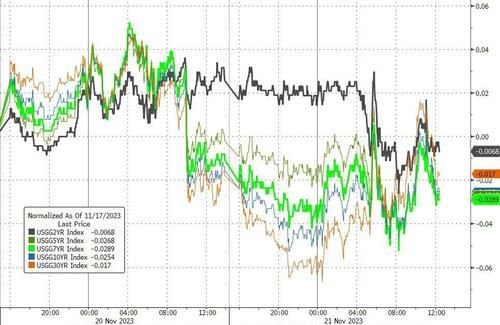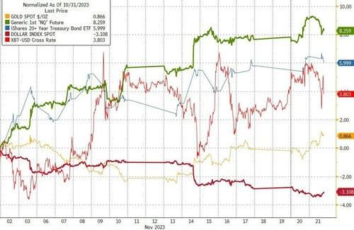 整体而言,自11月1日的美联储决议以来,美元已经下跌了3%以上,并推动股票、债券和比特币都走高(黄金也是如此,尽管幅度很小)……