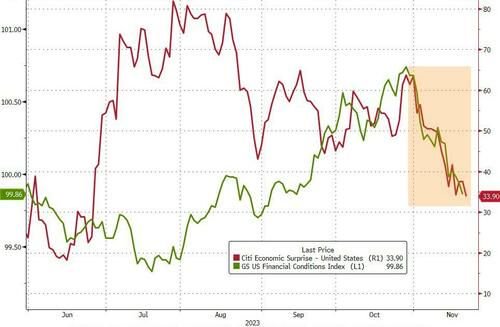 也许最为值得注意的是,自从美联储强调市场“正在履行其职责”(通过收紧金融环境)以来,美国宏观经济数据接连令人失望,金融环境已大幅趋于宽松……