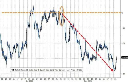 收益率曲线也大幅趋平(再次倒挂)……